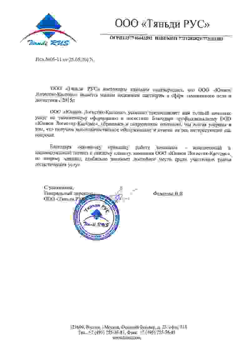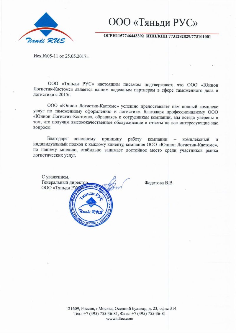 ООО «Тяньди Рус» настоящим письмом подтверждает, что ООО «Юнион Логистик-Кастомс» является нашим надежным партнером в сфере таможенного дела и логистики с 2015 г.