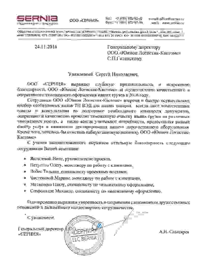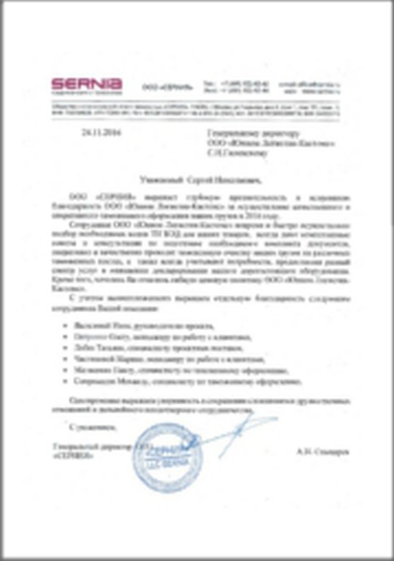 ООО «СЕРНИЯ» выражает глубокую признательность и искреннюю благодарность ООО «Юнион Логистик-Кастомс» за осуществление качественного и оперативного таможенного оформления грузов в 2016 году.