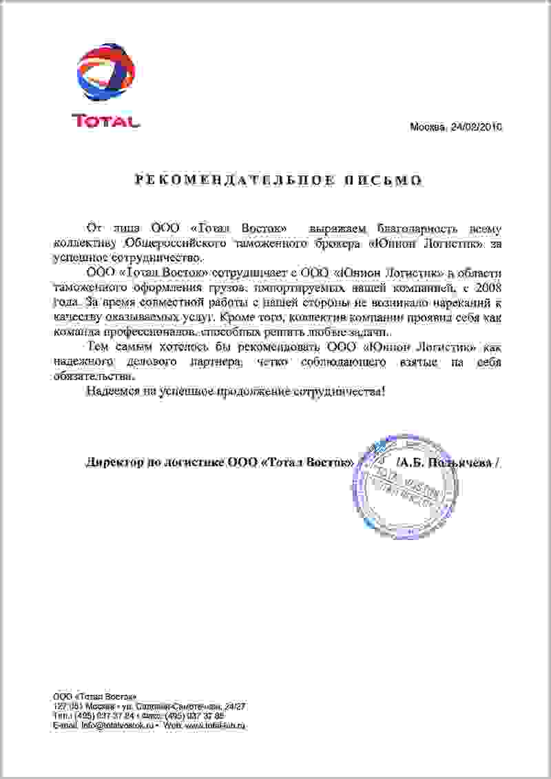 ООО «Тотал Восток» сотрудничает с ООО «Юнион Логистик» в области таможенного оформления грузов, импортируемых нашей компанией с 2008. За время совместной работы с нашей стороны не возникало нареканий к качеству оказываемых услуг. Кроме того, коллектив компании проявил себя как команда профессионалов, способных решить любые задачи.